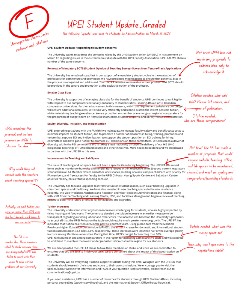 Recently, UPEI Administration sent a message to UPEI students that purports to address students’ concerns around negotiations. We believe this message is misleading and have marked it accordingly.
